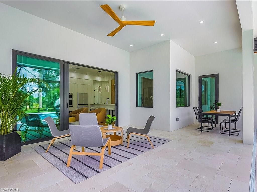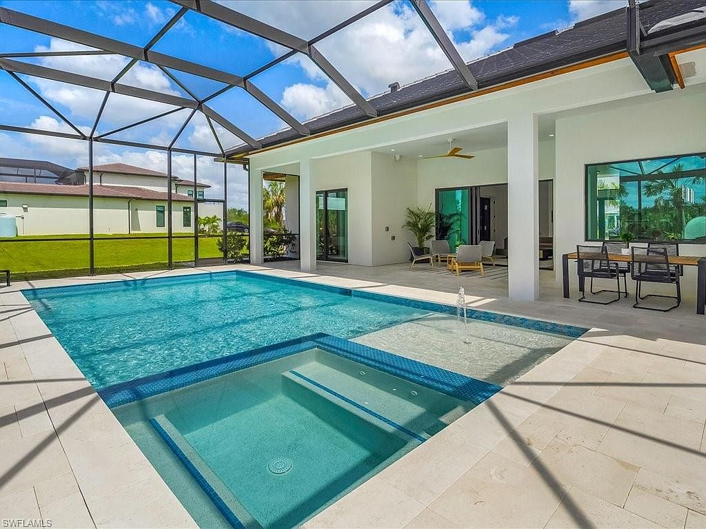 This spacious outdoor patio features a rectangular swimming pool with a built-in hot tub, bordered by light beige stone tiles that enhance the clean and modern aesthetic. The pool area is enclosed by a black metal frame screen, allowing for an abundance of natural light while keeping insects away. Neutral tones dominate the space, with white exterior walls creating a bright backdrop for outdoor seating areas furnished with minimalist chairs and a small table. A ceiling fan and greenery bring additional comfort and life to this inviting poolside retreat.