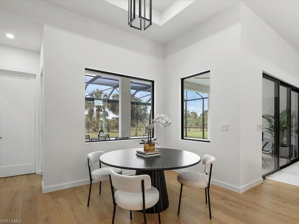 This cozy dining nook features a round black pedestal table surrounded by four sleek chairs with white upholstery and black legs, complementing the modern minimalist style. The space is bathed in natural light through two large windows offering views of a screened outdoor area and lush greenery beyond, enhancing the airy ambiance. The walls and trim are painted crisp white, creating a fresh and clean backdrop. Light-toned wood plank flooring adds warmth and texture, while a geometric pendant light hanging from the high ceiling adds a touch of contemporary elegance to the space.