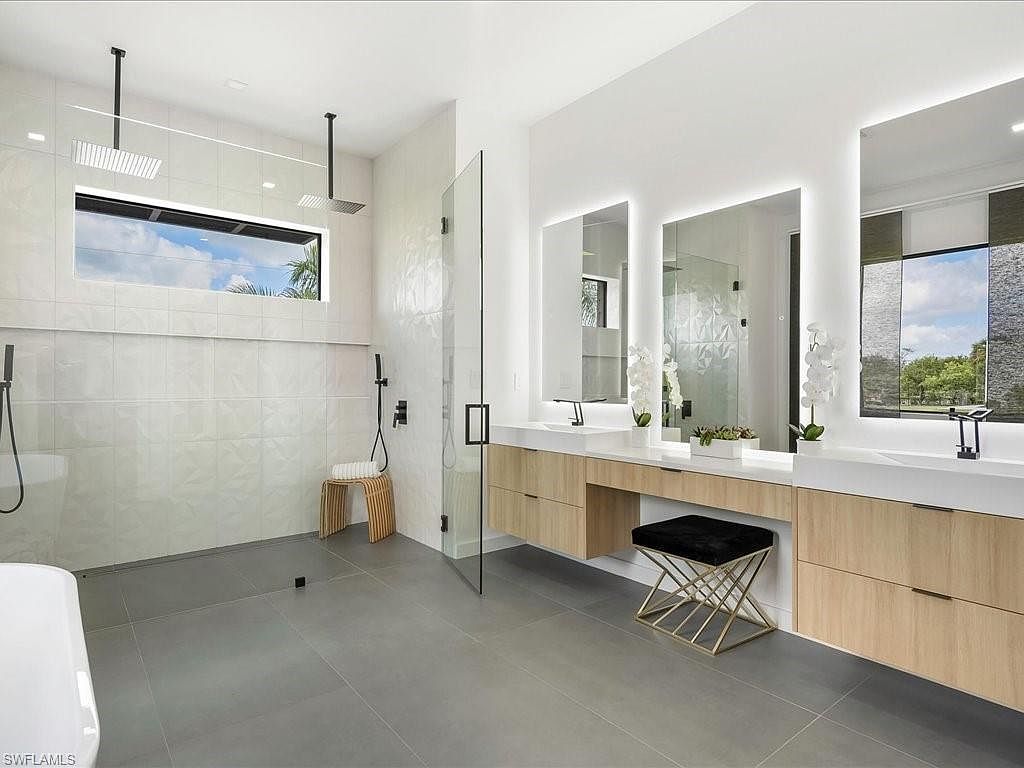This spacious bathroom features a sleek, contemporary design with an emphasis on clean lines and minimalism. The large walk-in shower is enclosed by clear glass with two modern overhead rain showerheads in matte black, complemented by matching handheld sprayers. The neutral color palette centers around light cream textured tiles and large gray floor tiles, creating an airy yet grounded feel. Opposite the shower, a floating double vanity with natural wood cabinetry and crisp white countertops offers ample storage and workspace. Two large, backlit mirrors provide even illumination, while a chic black cushioned stool with gold metal legs adds a subtle touch of elegance. The overall ambiance is bright, tranquil, and sophisticated, enhanced by the rectangular window that peeks at a cloudy blue sky and greenery outside, inviting natural light into the functional yet stylish space.