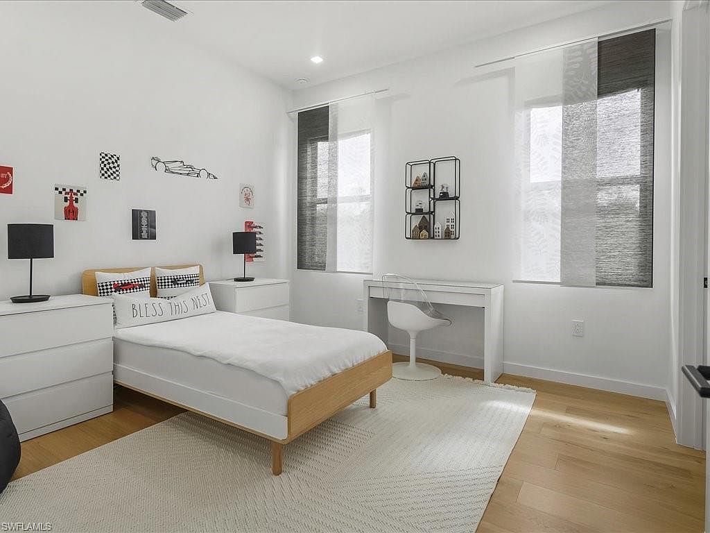 This serene bedroom emphasizes simplicity and clean lines with a contemporary minimalist approach. The bed features a light wood frame, topped with crisp white bedding and a decorative pillow reading “Bless This Nest,” adding a cozy touch. Two matching white dressers flank the bed, each adorned with a sleek black lamp, contributing contrast to the predominantly white space. The room’s walls are plain white with subtle automotive-themed wall art above the bed, offering a playful yet tasteful accent. Large windows are dressed with sheer and dark layered curtains that softly diffuse natural light. A modern white desk paired with a transparent swivel chair provides a functional workspace, while a light, textured rug grounds the wooden flooring, lending warmth and softness to the room’s airy atmosphere.