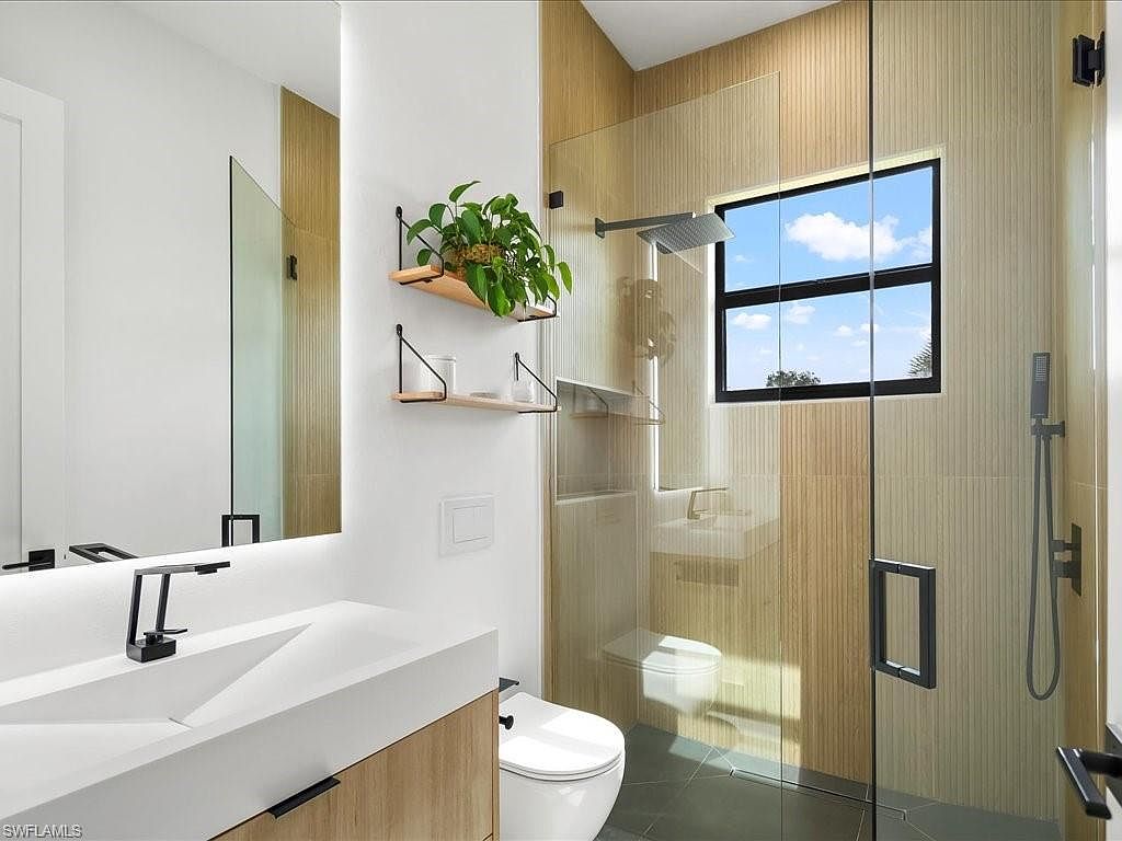 This modern bathroom features a sleek, streamlined design with a mix of natural textures and contemporary elements. Light wood paneling lines the shower walls, creating warmth that contrasts with the clean white vanity and minimalist rectangular sink. Matte black fixtures, including the faucet and showerhead, add bold accents throughout. The glass shower enclosure maintains an open, airy feel while letting natural light flow in from the large black-framed window. Two floating wood shelves with black metal brackets provide practical storage and enhance the room’s modern, natural aesthetic. Neutral flooring grounds the space with subtle sophistication.