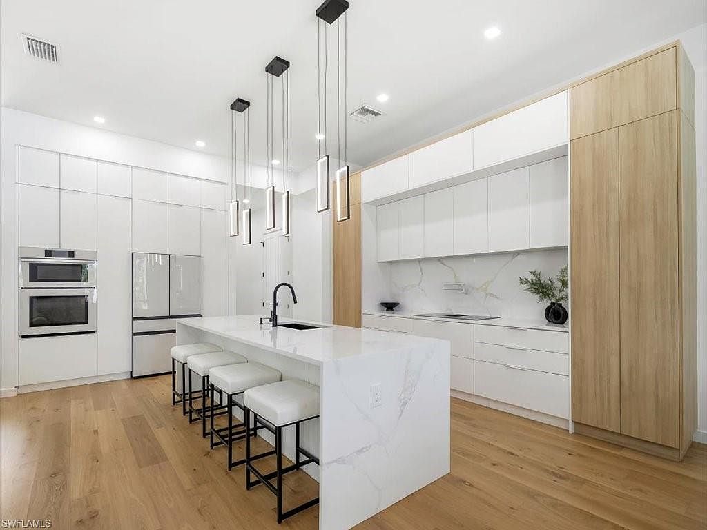 This kitchen features a sleek, contemporary design with a clean, bright white palette contrasted by natural wood accents. A large marble island occupies the center, serving both as a workspace and breakfast bar with four cushioned stools framed in black metal. Above the island, modern rectangular pendant lights hang in a linear arrangement, adding sophistication and focused illumination. Cabinets are seamlessly integrated, with high-gloss white fronts and natural wood panels framing the refrigerator and pantry area. Light wood flooring complements the cabinetry and adds warmth, while minimalistic hardware and a marble backsplash enhance the overall elegant aesthetic.