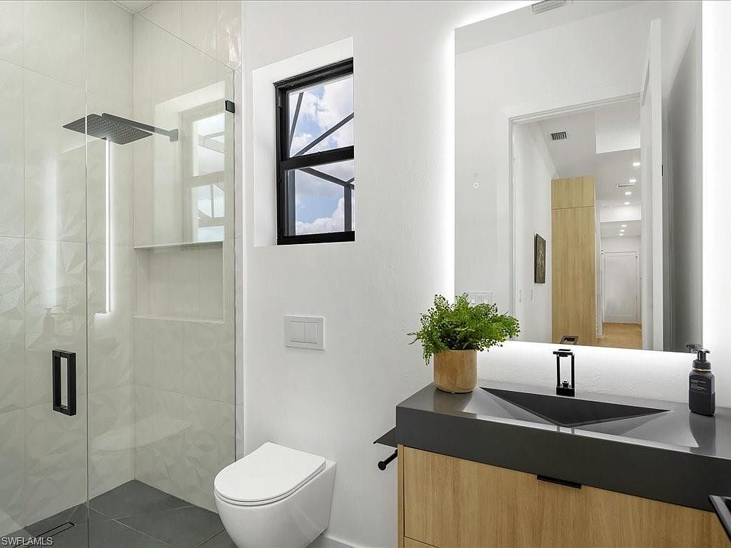 This bathroom features a sleek, contemporary design with a clean and minimalist aesthetic. The walk-in shower is enclosed with frameless glass, highlighting textured white tiles and a matte black, rain-style showerhead. The white wall surrounding the toilet enhances the crisp, fresh feel of the space. A floating vanity with light wood cabinetry contrasts strikingly against the dark gray countertop and integrated sink. A large, backlit mirror adds both functionality and a soft glow, while a small potted green plant brings a touch of nature. The black-framed window offers natural light, completing this elegant and functional bathroom setting.