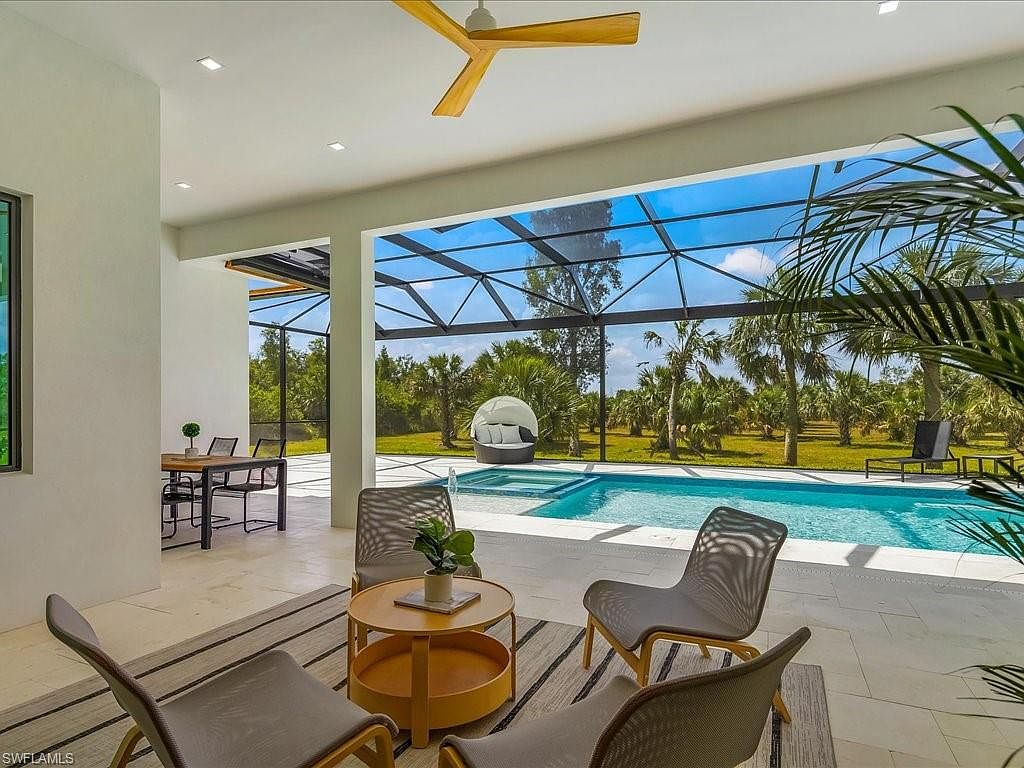 This outdoor patio offers a seamless transition to the enclosed pool area, featuring a modern design with clean lines and soft neutral tones. The seating arrangement includes comfortable lounge chairs with wooden legs and a round, light wooden coffee table atop a striped rug, creating an inviting conversation space. The ceiling is accented with a contemporary wood-finish ceiling fan, adding warmth to the minimalist white ceiling. The screen enclosure provides unobstructed views of palm trees and lush greenery beyond the pool, enhancing the airy, open feeling. The pool itself is spacious, ideal for both relaxation and exercise.