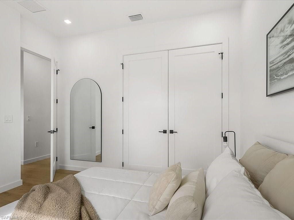 This bedroom corner showcases a clean, minimalist design emphasizing calmness and functionality. The walls and doors are painted crisp white, enhancing the room’s brightness and spacious feel. A set of double closet doors with modern black handles creates a striking contrast against the white surfaces. Adjacent to the closet is a tall, arched wall mirror with a thin, black frame, adding depth and elegance. The bed features neutral-toned pillows and a cozy beige throw, complemented by a subtle, abstract wall art piece. Warm wooden flooring brings natural warmth to the otherwise monochrome palette.