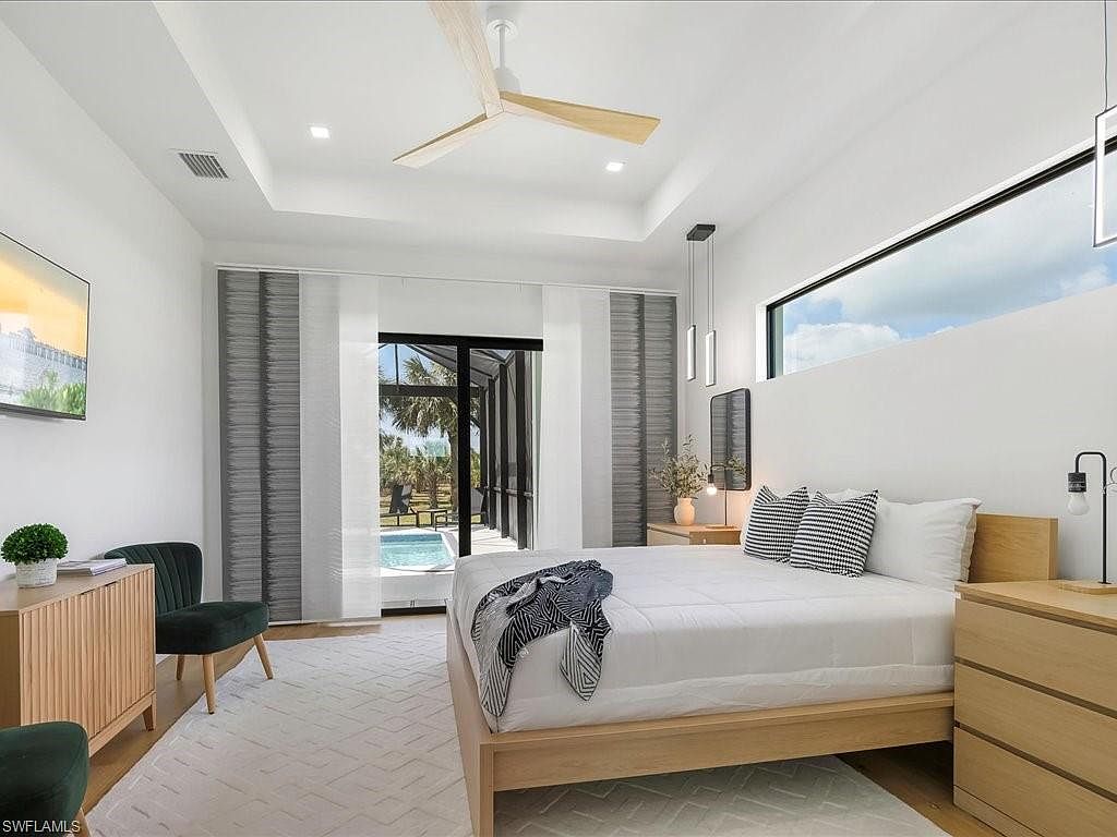 This serene master bedroom features a minimalist design with natural wood furniture including a low-profile bed frame and matching nightstands. Crisp white walls and bedding create a bright, airy feel, enhanced by a modern ceiling fan with light wooden blades. Two green velvet chairs add a pop of color and texture, while the soft geometric rug anchors the room. A long horizontal window near the ceiling allows natural light to pour in without compromising privacy. Sliding glass doors open to a pool area, connecting the indoor space harmoniously with the outdoors. Accent lighting and modern decor complete the tranquil, contemporary ambiance.