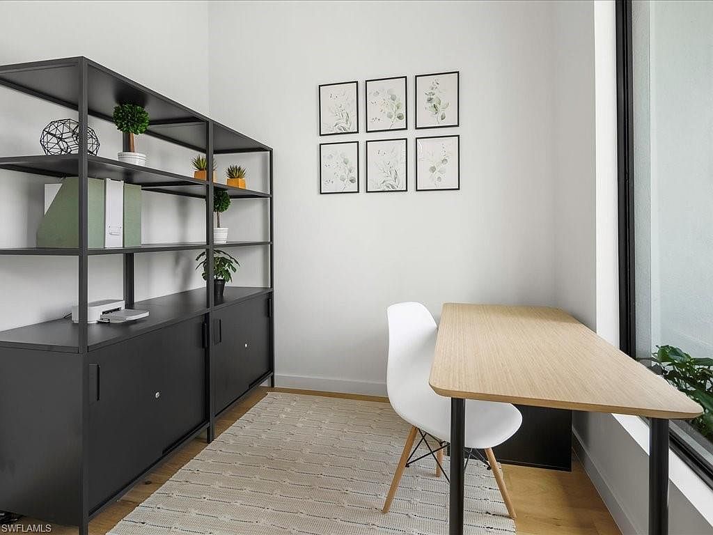 This compact home office is designed with simplicity and function in mind. The room features a light wooden desk with black metal legs positioned beside a large window, allowing ample natural light to brighten the space. A sleek white chair with wooden legs complements the desk and adds a modern touch. Against one wall, a tall black shelving unit provides open and closed storage options and supports small green plants and decor, introducing subtle pops of color. Neutral tones on the walls and a textured beige rug create a calm, focused atmosphere ideal for productivity.