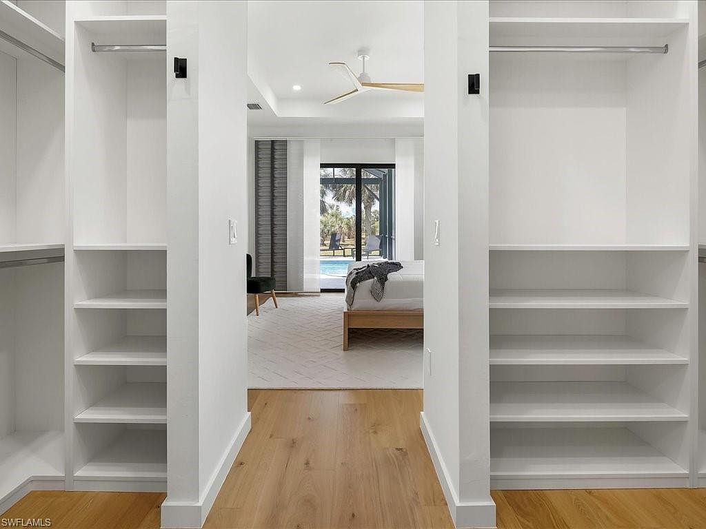 This space serves as a bright, organized walk-in closet leading into a bedroom. The narrow corridor showcases built-in shelving and hanging rods on both sides, painted in crisp white to enhance light and cleanliness. Natural wood flooring adds warmth, contrasting subtly with the white walls and closet interiors. Beyond the closet, the bedroom features a modern wooden bed frame with simple linens and a dark throw, maintaining a minimalistic aesthetic. A ceiling fan with wooden blades complements the floor’s tone, while large glass doors open to a pool area, inviting natural light and an airy indoor-outdoor flow.