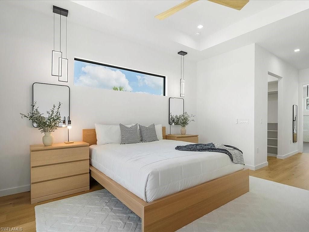 This serene master bedroom showcases a sleek, minimalist design with natural wood furnishings and soft white walls. A platform bed with a light wood frame anchors the space, dressed in crisp white bedding complemented by two patterned throw pillows and a dark throw. Matching wooden nightstands on each side hold simple vases with greenery and modern lamps, contributing a touch of nature and warmth. Above, contemporary pendant lights add understated elegance. A horizontal window near the ceiling floods the room with natural light, while the light wood floor continues into a connected walk-in closet visible through an open doorway. The clean lines and neutral palette create a calm retreat.