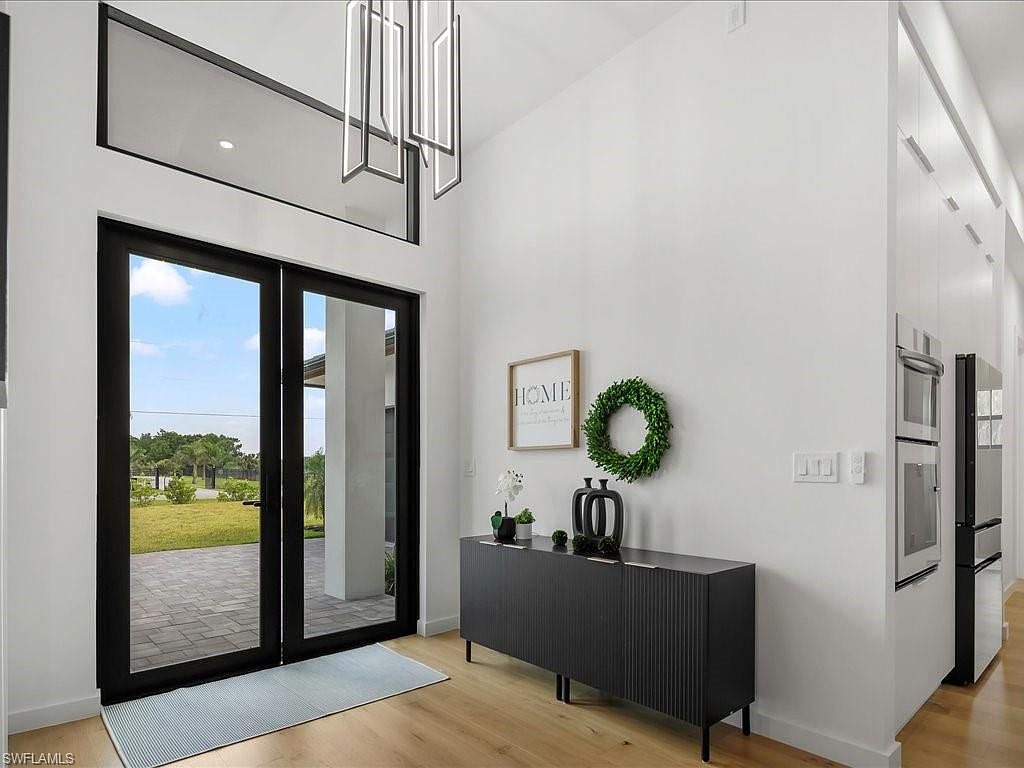 This entryway features a clean and modern aesthetic highlighted by the contrast between the black-framed glass double doors and the surrounding white walls. The tall ceilings create an airy and open atmosphere, emphasizing vertical space. A sleek black console with vertical grooves stands against one wall, adorned minimally with a small green wreath, two modern black vases, and a few small plants, lending a touch of nature and personality. Light gray runner rug grounds the space on warm wood plank flooring. The design expresses simplicity with functional elegance, welcoming natural light and outdoor views.