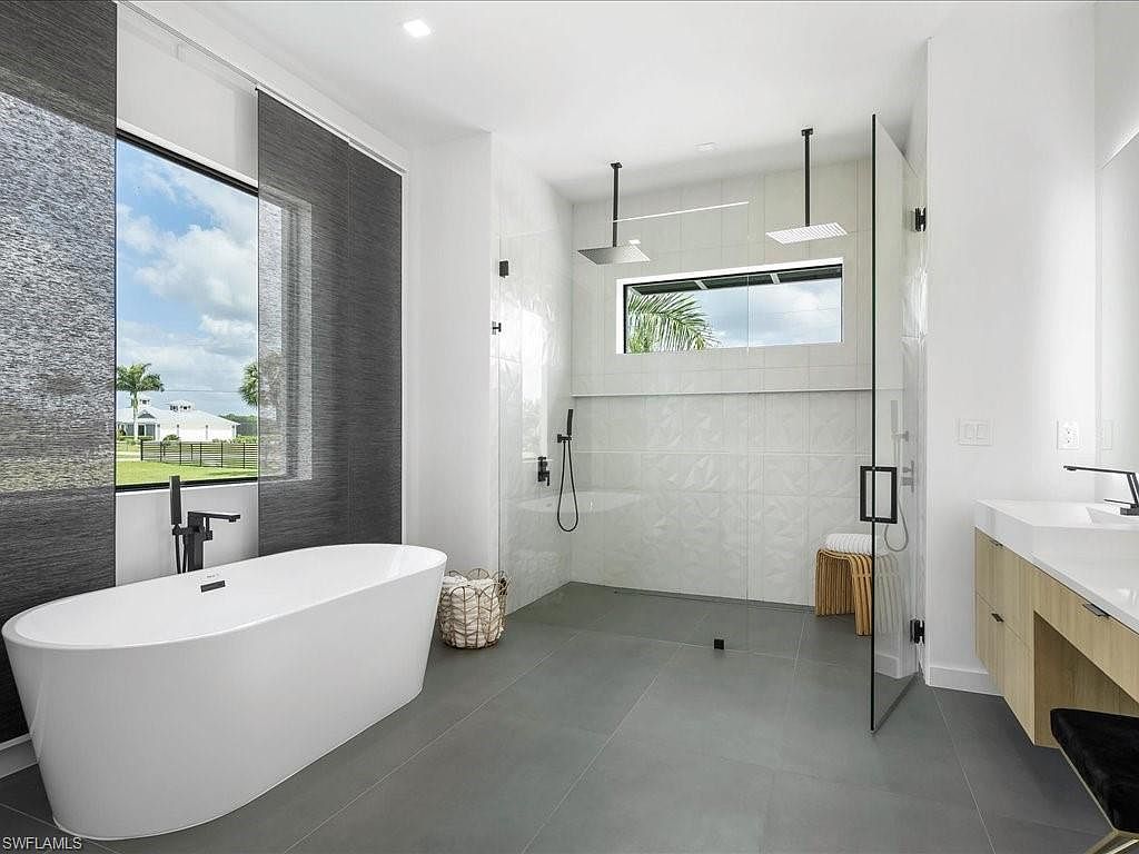 This spacious bathroom features a minimalist design with a sleek freestanding white bathtub positioned near large windows covered by subtle, textured grey shades that allow natural light while maintaining privacy. Adjacent is an open, walk-in shower with a dual rainfall showerhead setup mounted on the ceiling, paired with black matte fixtures to add contrast. The shower walls are tiled with a sophisticated, textured white pattern, complementing the smooth grey floor tiles that extend throughout the space. Across from the shower is a floating wooden vanity with a white countertop and modern matte black faucet, contributing to the clean, contemporary aesthetic enhanced by the bright, natural light streaming through the window.