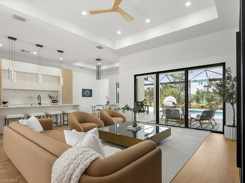This open-concept living area features a warm and inviting palette with caramel-colored sofas and armchairs centered around a sleek black coffee table atop a light, textured rug. The space seamlessly transitions into a minimalist kitchen, adorned with white cabinetry and natural wood accents. Three modern pendant lights hang above the kitchen island, which doubles as a casual breakfast bar with neutral-toned stools. The high, recessed ceiling with a wooden ceiling fan adds airiness. Floor-to-ceiling glass sliding doors frame a serene outdoor patio with pool views, inviting natural light and nature into the modern interior.
