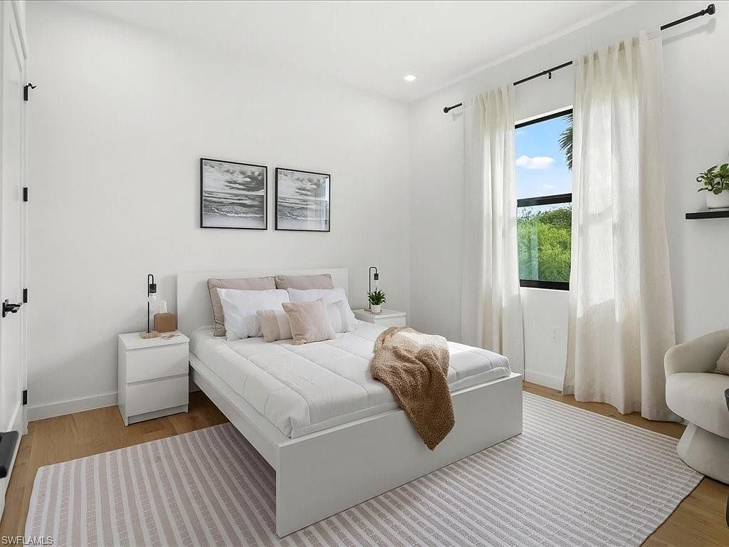 This peaceful bedroom features a modern, minimalist layout centered around a white platform bed adorned with neutral-toned bedding and soft accent pillows. Two matching white nightstands with sleek black reading lamps frame the bed, adding symmetry and function. The room’s walls are painted bright white to maximize natural light that flows in through a moderately sized window dressed with sheer ivory curtains. Warm wooden flooring contrasts gently with a subtle striped area rug, creating a cozy underfoot feeling. Simple black-and-white coastal-themed art above the bed and a small potted plant on one nightstand add understated decor touches, emphasizing calm sophistication and comfort.