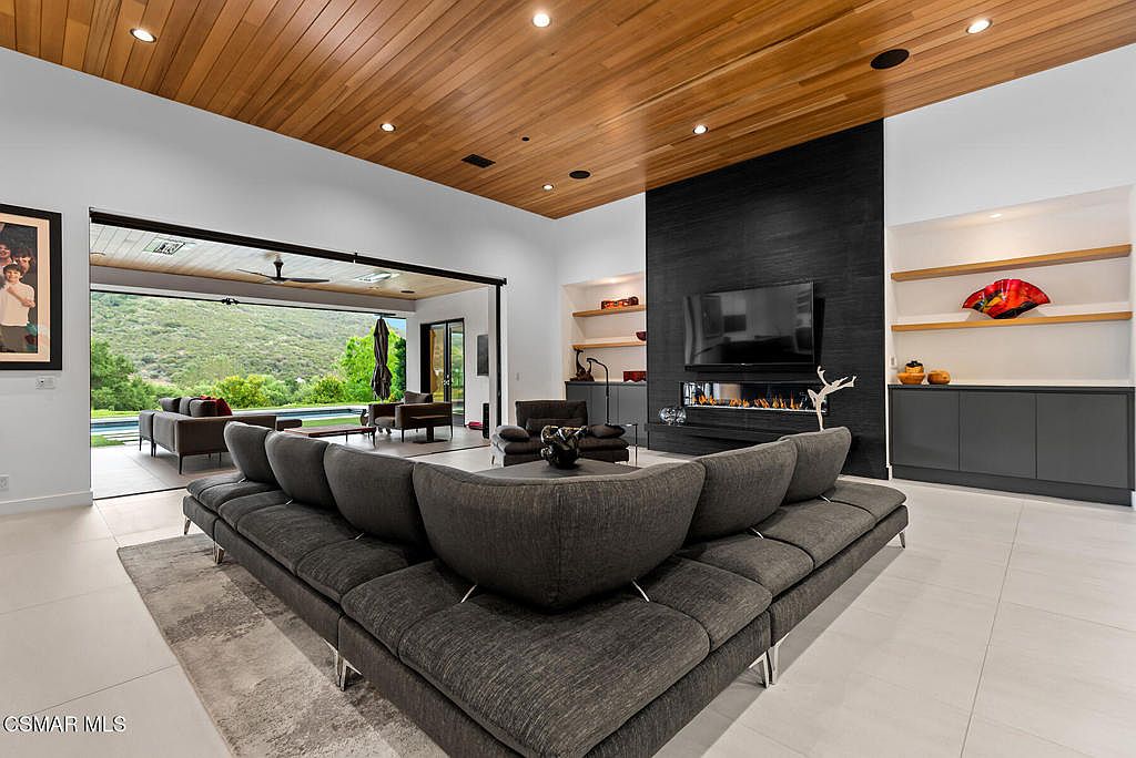 This spacious living room boasts a modern, open-concept layout seamlessly connecting to a covered patio with scenic greenery beyond. The space features a dramatic contrast of a warm wood-paneled ceiling against cool, light-colored tile flooring, enhancing a sleek aesthetic. A large, dark sectional sofa forms a central seating area, grounded by a subtle area rug. A striking black feature wall anchors a linear fireplace beneath a mounted flat-screen TV. Flanking built-in shelves and cabinets with minimalist decor further enhance the clean lines and contemporary feel. Expansive sliding doors fully open to blend indoor comfort with outdoor relaxation.