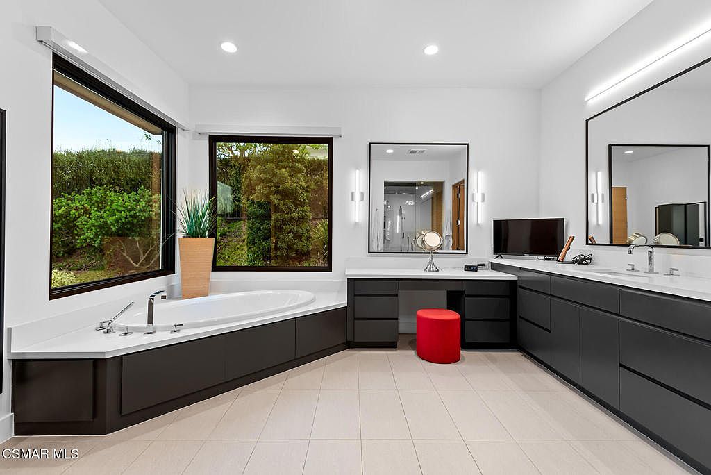 This bathroom features a sleek and spacious layout with a corner soaking tub surrounded by black cabinetry and white countertops. Large windows next to the tub allow natural light to flood in, offering garden views and enhancing the room’s openness. The vanity area is equipped with two sizable mirrors framed in black, complemented by vertical wall lights on each side for even illumination. The cabinetry beneath the sinks and around the vanity is matte black, adding a modern contrast to the white walls and beige tiled floors. A red cushioned stool introduces a vibrant pop of color, balancing the monochrome palette with subtle warmth and style.