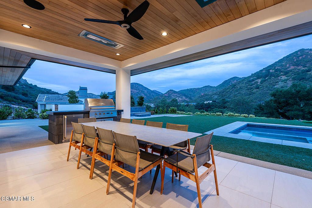 This covered outdoor dining space features a sleek rectangular table accompanied by eight wooden-framed chairs with neutral-toned cushioning, perfect for al fresco meals. The ceiling is clad in warm wood panels, complemented by modern black ceiling fans to provide comfort on warmer days. A built-in stainless steel grill and countertop area are visible, ideal for outdoor cooking and entertaining. The flooring is done in large light tiles, creating a clean and seamless transition to the well-manicured grass lawn and a built-in rectangular pool. Rolling hills and lush greenery surround the backyard, enhancing the tranquil mountain views.