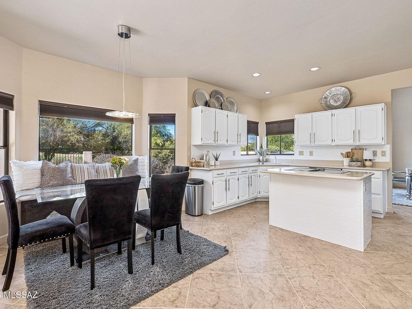 This open kitchen and breakfast nook area features a bright and airy layout with beige tile flooring that complements the light wall color. The kitchen cabinets are white with simple panel detailing and modern silver hardware, providing ample storage. A central island adds workspace with a beige countertop matching the perimeter counters. The adjacent breakfast nook has a glass-top table paired with four black upholstered chairs and a cushioned built-in bench adorned with textured and patterned pillows, creating a cozy and inviting dining spot. Multiple windows with dark roller shades bring natural light and outdoor views, enhancing the fresh and welcoming atmosphere. The overall aesthetic is clean and neutral with subtle contrasts, blending functionality with casual elegance.