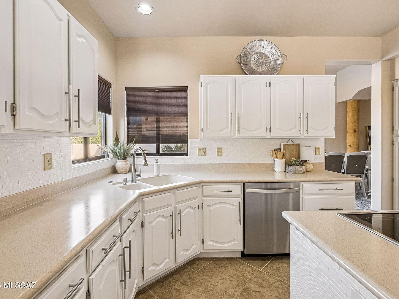 This kitchen area features a clean and bright aesthetic with white cabinetry featuring raised panel doors and modern brushed metal handles. The L-shaped countertop is a smooth, light beige surface that creates a spacious workspace and complements the neutral wall color. The backsplash is a subtle white textured tile that adds depth without overwhelming the space. Stainless steel appliances, including a dishwasher, enhance the kitchen’s modern feel. A double sink is positioned beneath a window with dark blinds that contrast softly against the light walls and cabinets. The floor is tiled with earth-toned ceramics, harmonizing with the overall warm palette. A decorative metal tray and some greenery add a touch of character to the otherwise minimal and functional design.
