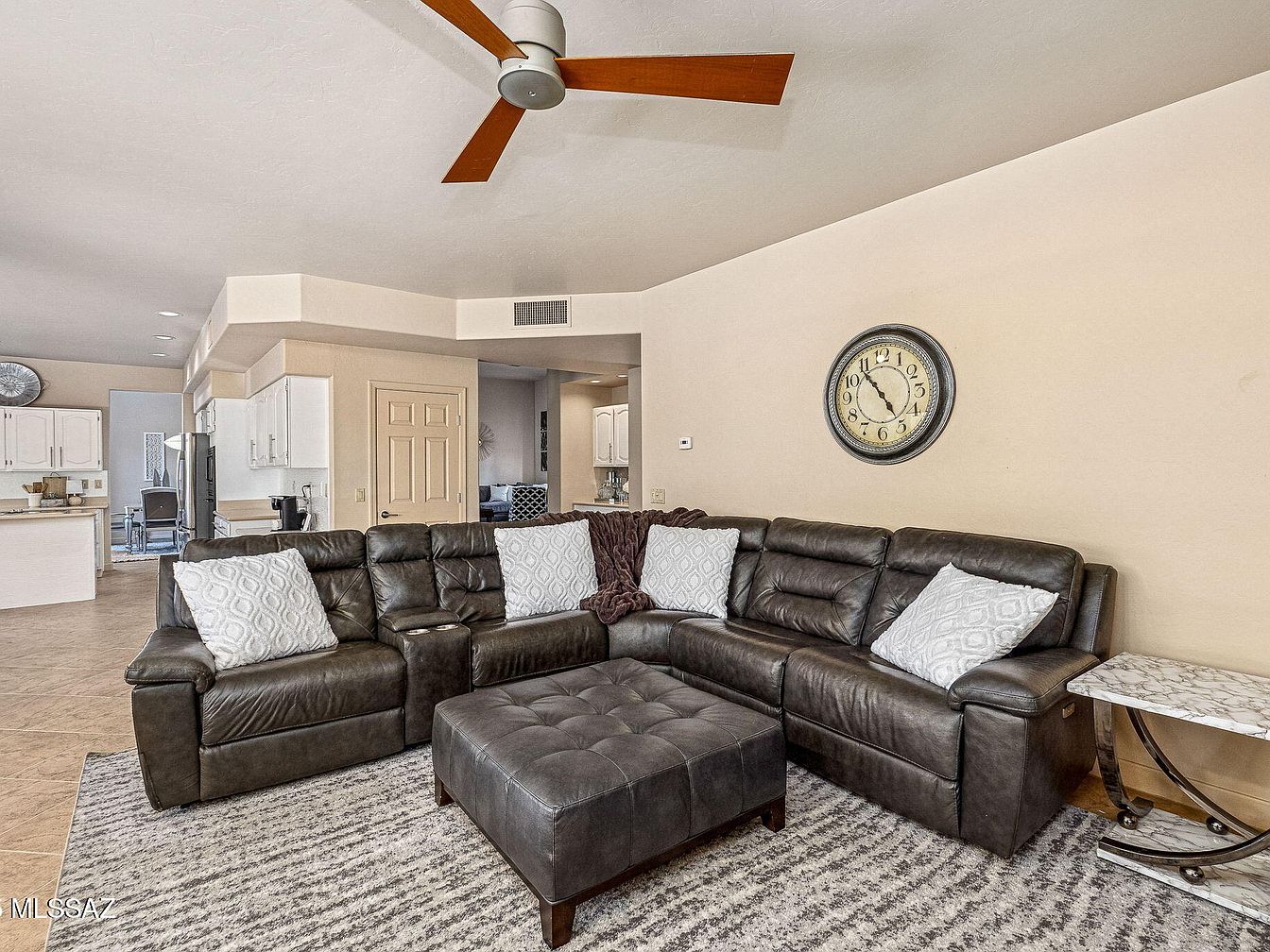 This spacious living room features a large, dark leather sectional sofa arranged in an L-shape, accented with textured white throw pillows and a deep brown knitted blanket. A matching tufted leather ottoman serves as a central coffee table, resting on a patterned gray area rug that defines the seating zone. Neutral beige walls and light tile flooring set a warm, inviting tone, while a wall clock adds a touch of classic charm. The ceiling fan with wooden blades complements the earthy color palette. The open layout flows into a bright kitchen with white cabinetry, visible in the background.