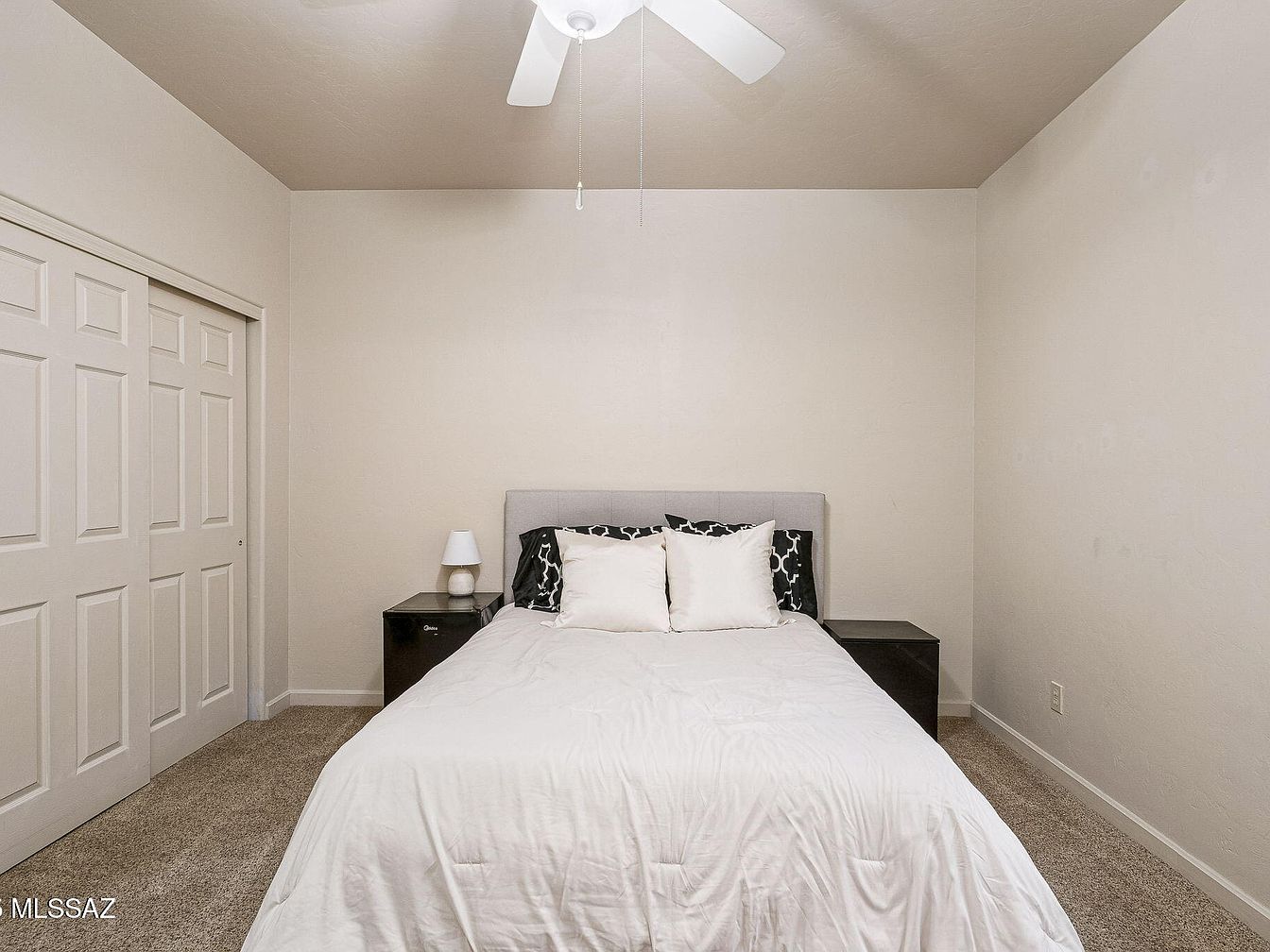 This bedroom features a simple and clean layout with neutral tones creating a calm atmosphere. The bed is centered against a plain, light-colored wall, dressed in a white comforter complemented by two decorative white pillows and matching black pillows with a geometric pattern. On either side of the bed are minimalistic black nightstands, one topped with a small white lamp for balanced symmetry. The flooring consists of beige carpeting that adds warmth to the space. A white ceiling fan hangs overhead, enhancing air circulation. To the left, a sliding door closet offers practical storage while maintaining the room’s uncluttered feel.
