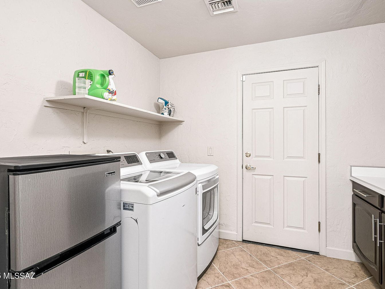 This laundry room offers a clean and organized space, showcasing white textured walls and light beige ceramic tile flooring arranged diagonally for a subtle visual interest. The room includes a white top-loading washing machine and matching front-loading dryer, positioned side by side. Above them, a simple white wall-mounted shelf holds laundry essentials, maintaining functional minimalism. A compact stainless steel mini-fridge sits adjacent to the machines, adding convenience. On the right, dark cabinetry with sleek, modern handles offers storage and is topped with a white countertop. The room is completed by a paneled white door, maintaining the neutral and cohesive aesthetic.