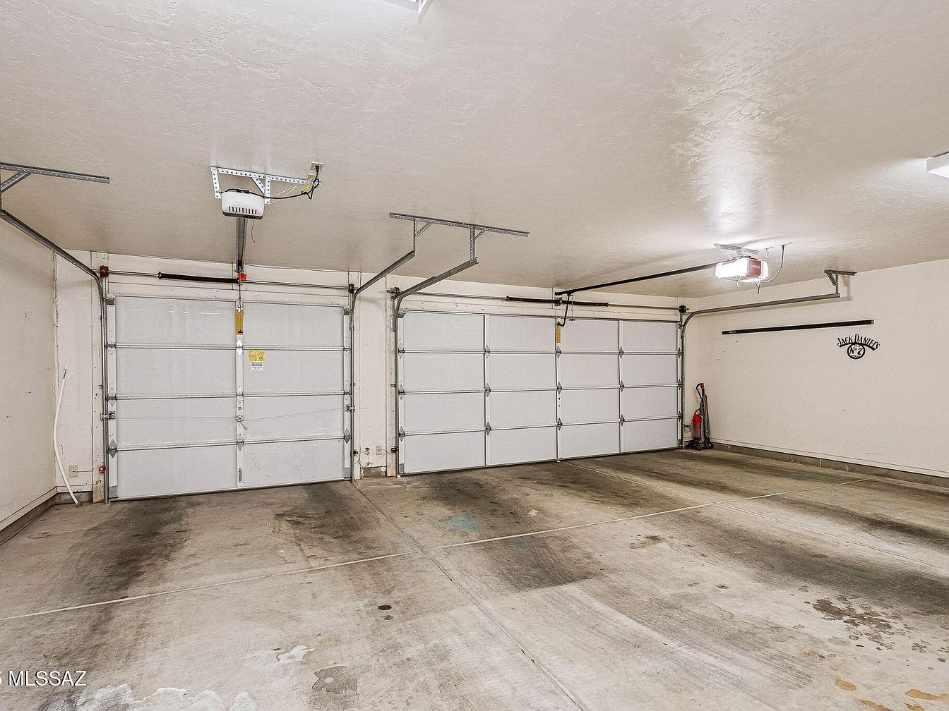 This spacious garage is designed to accommodate multiple vehicles with two large white paneled garage doors outfitted with automatic openers. The walls and ceiling are painted white, creating a bright and clean atmosphere despite concrete flooring showing some wear and use marks typical for a garage. Minimalist in style, this space is functional and uncluttered, aside from a vacuum cleaner stored in the corner and a decorative “Jack Daniels” sign mounted on the far wall, adding a subtle personal touch. The overall layout emphasizes practicality and ample parking space.