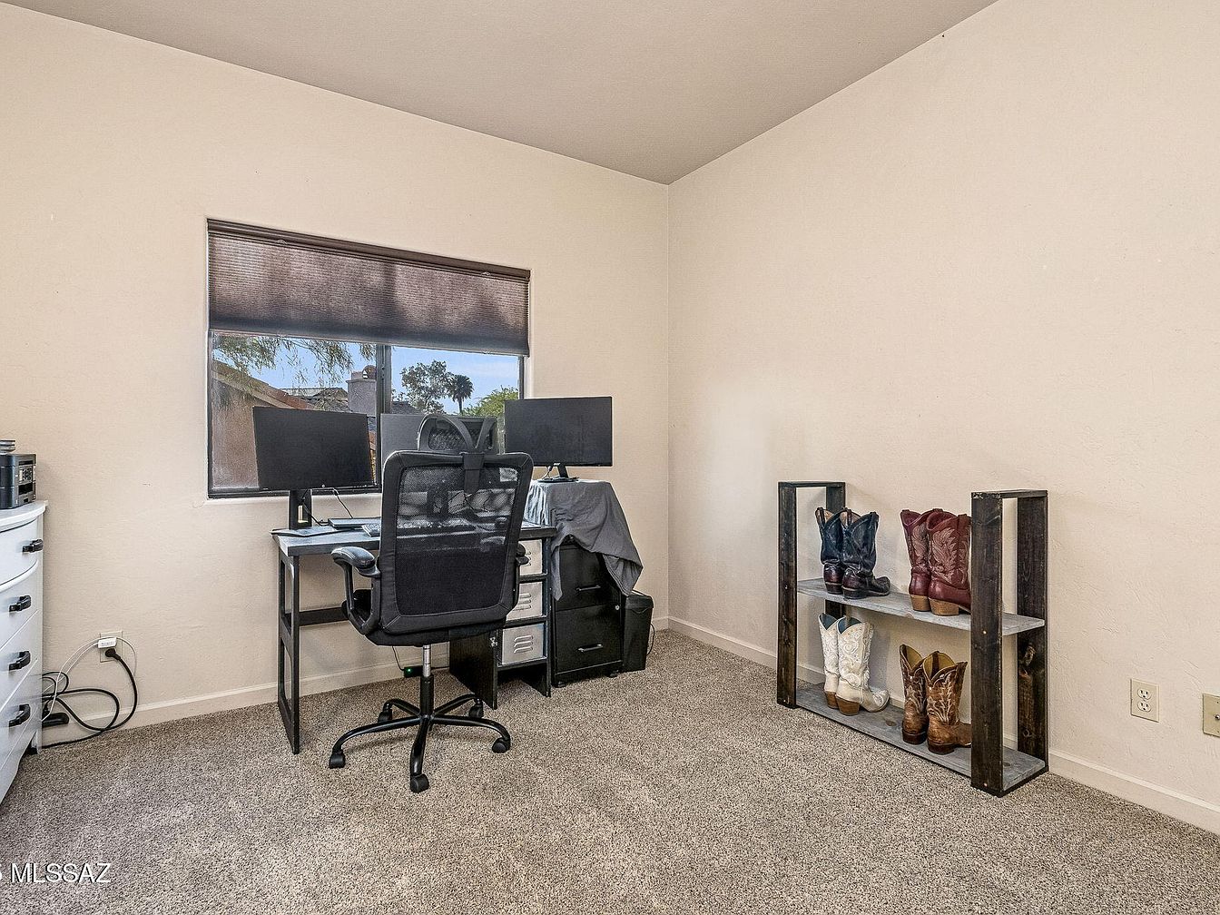 This compact home office corner features a neutral color palette with beige walls and light carpet, creating a calm and unobtrusive workspace. A large window with a dark roller blind allows natural light to filter subtly, offsetting the room’s simplicity. The black mesh ergonomic chair plugs into a minimalist black desk housing dual monitors, emphasizing productivity. A small file cabinet and printer sit nearby, adding practicality. On the opposite side, a rustic industrial-style open shelf showcases an assortment of cowboy boots, infusing personality and a touch of western charm into the otherwise straightforward design.