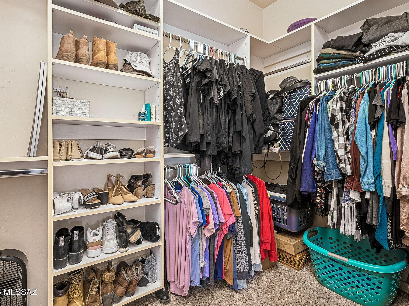 This well-organized walk-in closet offers ample storage with a clean, white shelving and hanging systems that maximize space efficiently. The left side features multiple shelves neatly displaying a variety of shoes, including boots and heels, while the right side has two rows of hanging rods filled with colorful and black clothing, organized by type and color. The carpeted floor adds warmth to the neutral beige walls. Various storage bins and baskets fit snugly beneath the hanging clothes, highlighting functional design. This closet blends style and practicality, creating an inviting space for daily dressing and storage needs.