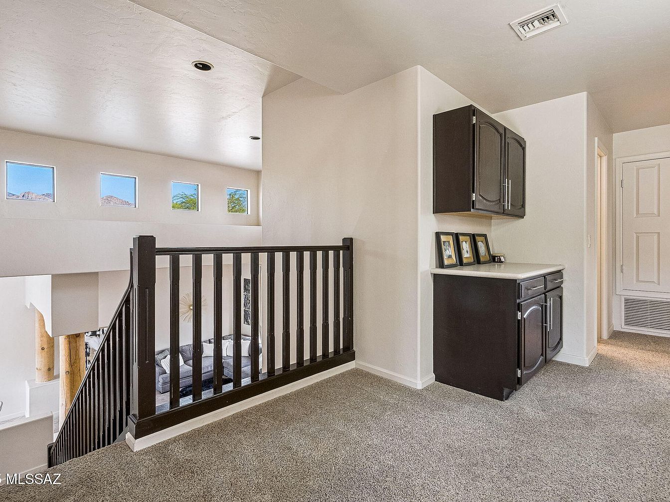 This bright upstairs landing offers a transitional space between rooms, featuring neutral beige carpet that complements soft off-white walls. A dark wooden railing with vertical slats creates a striking contrast while allowing open sightlines to the living area below. The landing includes built-in cabinetry with a smooth countertop in white, topped with dark wood cabinets, providing functional storage and display space for framed photos. Small square windows near the ceiling flood the area with natural light, capturing outdoor views and enhancing the airy, open feel of the high-ceilinged design.