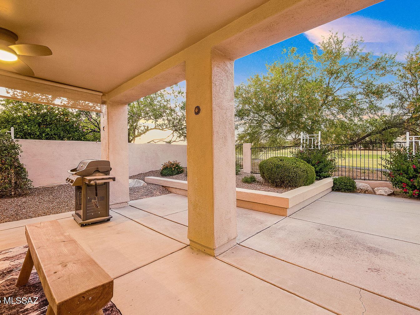 This covered patio features a smooth concrete floor with clean grout lines, providing a tidy and durable outdoor surface. Large stucco columns create a welcoming architectural frame, supporting an overhead ceiling with a modern ceiling fan for comfort. A simple wooden bench offers casual seating, complemented by a compact gas grill, indicating space for outdoor cooking and entertaining. The backyard is enclosed by a low, light-colored stucco wall and a black metal fence, beyond which lush greenery and mature trees extend, creating a serene and private garden ambiance. This space seamlessly blends simplicity and functionality.