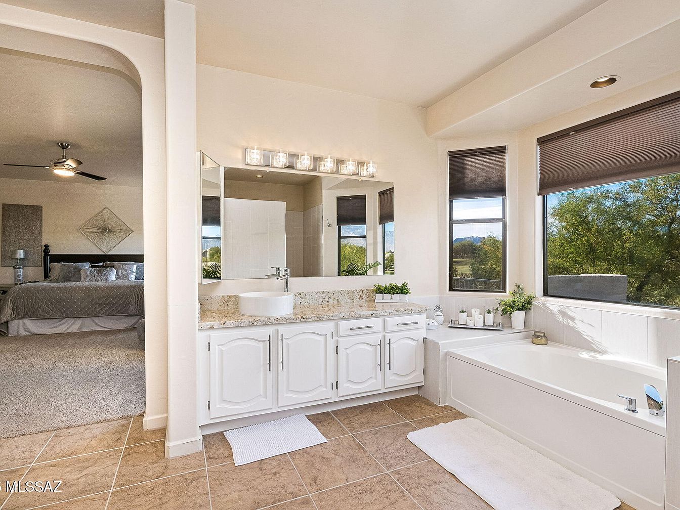This master bathroom features a spacious layout with a large soaking tub positioned next to wide windows, offering natural light and serene views of greenery outside. The room is styled with neutral beige walls and large tan floor tiles that provide a warm base. White cabinetry with classic paneled doors supports a granite countertop equipped with a modern vessel sink and sleek faucet. Above the vanity, a large mirror with a row of clear glass bulb lighting enhances brightness. Adjacent to the bathroom, the master bedroom is partially visible, carpeted with soft beige tones and equipped with a ceiling fan, decorated in muted, cozy textiles for a calm retreat feeling.
