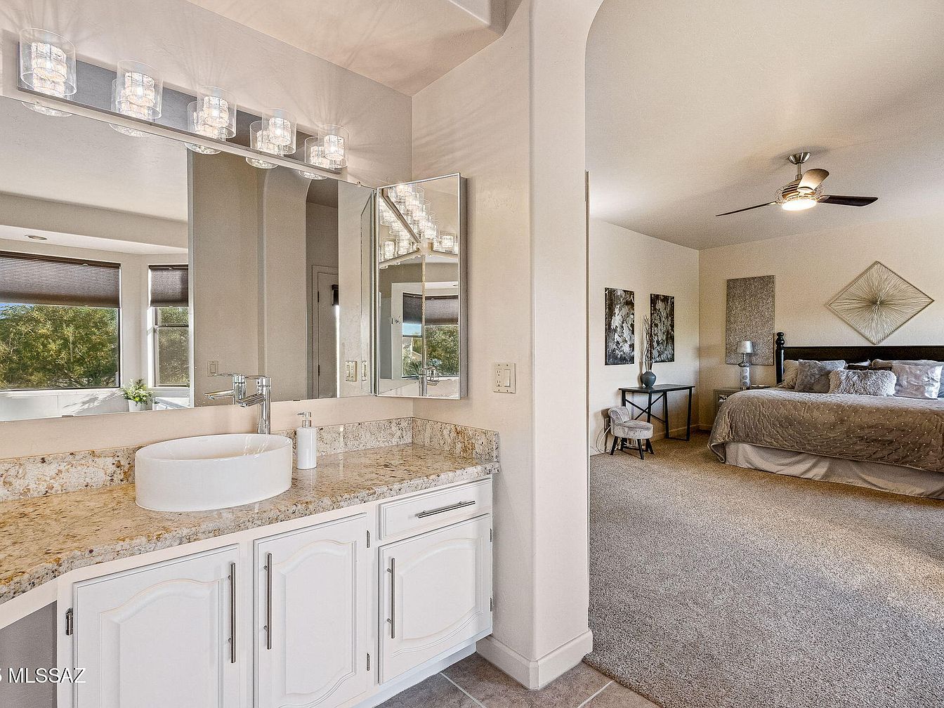 This bedroom features a cozy, inviting layout with neutral tones anchored by the soft beige carpet and light cream walls that create a warm, tranquil atmosphere. The large bed is adorned with plush gray and cream bedding accented by a textured beige throw, complemented by unique metallic wall art above the headboard. A sleek, modern ceiling fan with a light provides both functionality and style. The adjacent vanity area includes a granite countertop with a white oval vessel sink and white cabinetry, illuminated by a row of stylish globe lights, and separated from the bedroom by a partial wall, adding a touch of elegance and convenience.