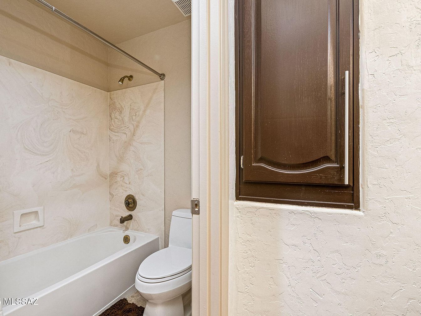 This compact bathroom combines functionality and simplicity. A white bathtub with smooth, marbled wall surrounds dominates one side, featuring subtle swirls of beige and cream that introduce soft texture. The bronze-colored fixtures, including the faucet, showerhead, and drain, add a warm metallic contrast to the neutral palette. Adjacent to the tub is a sleek, white modern toilet with a streamlined design. The entryway showcases beige walls with a rough stucco finish and a dark wood cabinet mounted on the wall, providing storage space while enhancing the room’s warmth and visual interest.