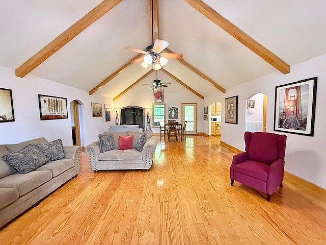 This expansive living room features a vaulted ceiling accentuated by exposed wooden beams, adding warmth and architectural interest. The light natural wood flooring complements the neutral-colored walls, creating a bright and inviting atmosphere. Furnishings include a mix of soft gray sofas adorned with patterned cushions and a standout deep red armchair that adds a pop of color. Ceiling fans with light fixtures provide both comfort and illumination. Art pieces and framed pictures are thoughtfully arranged on the walls, enhancing the room’s cozy yet open layout. The space flows seamlessly into a dining area and kitchen, visible through arched doorways.