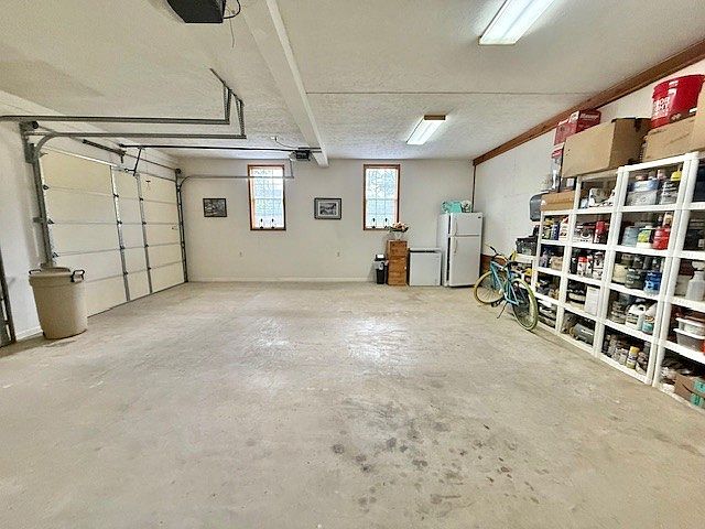 This spacious garage features a concrete floor with subtle stains, contributing to a practical, utilitarian atmosphere. Natural light filters in through two small windows with translucent glass blocks, accentuating the clean white walls and enhancing visibility. On the right side, a large, organized shelving unit holds an assortment of paint cans and household items, implying a well-maintained storage system. A vintage blue bicycle leans casually nearby. The back wall includes a small refrigerator and a few wooden drawers, offering additional functional storage. A standard white garage door occupies the left side, confirming easy vehicle access and a functional workspace feel.