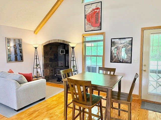 This cozy dining area blends seamlessly with the adjacent living space, opening up to a high vaulted ceiling with natural wood beams adding warmth and architectural interest. The hardwood floors run throughout, enhancing the inviting atmosphere. A wooden dining table with matching chairs anchors the space, positioned near large windows that flood the room with natural light. The living area includes a cushioned sofa with accent pillows in neutral and orange tones, facing a charming stone fireplace set within a recessed alcove. Modern floor lamps with tiered shelves add both light and decorative function, while framed artwork and a glass-paned door to the right complete this tasteful, functional corner of the home.