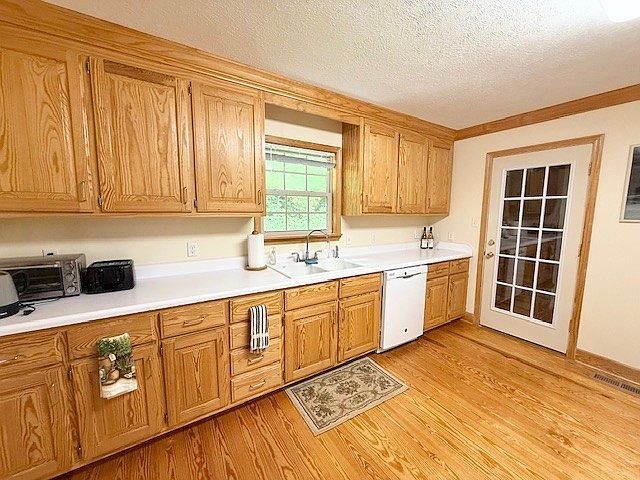 This kitchen features a warm and inviting design with oak cabinetry that lines one entire wall, offering ample storage and a cohesive wood tone that complements the hardwood flooring. The white countertops and backsplash provide a clean and bright contrast to the natural wood. Centered beneath a large, paned window is a white double sink with a classic faucet, allowing natural light to flood the workspace. Appliances like a dishwasher and small toaster ovens occupy the counter, while a decorative mat and a hand towel add subtle touches of homeliness. A door with multiple glass panes leads out, suggesting easy outdoor access and enhancing the room’s openness and airy feel.
