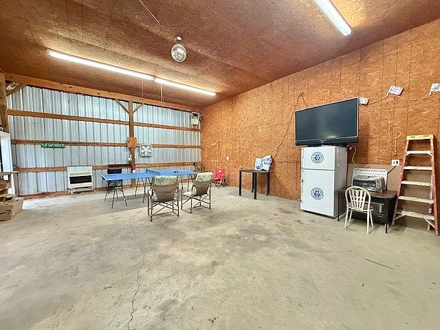 This spacious garage or workshop area features a utilitarian design with exposed particle board walls and a concrete floor marked with wear and cracks, emphasizing functionality. The ceiling has fluorescent tube lighting providing bright, even illumination, complemented by a small hanging fan and an exhaust fan along the back wall. Furnishings are minimal, including a folding table with simple chairs set up for informal use. A television is mounted above two white storage cabinets, and a wooden ladder leans against the side wall. The overall look prioritizes practicality over decoration, highlighting an adaptable, multi-purpose work or gathering space.