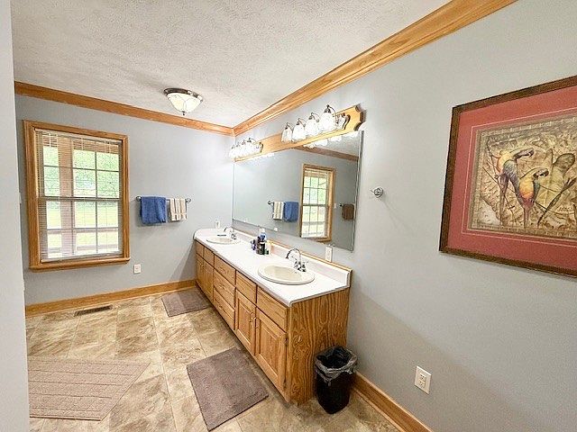 This spacious bathroom features a dual-sink vanity with natural wood cabinetry, topped by a broad white countertop that contrasts softly with the light gray walls. A large, framed mirror extends across the vanity length, brightly illuminated by a row of vintage-style bulb sconces providing warm, ambient lighting. The floor is laid with large neutral-toned tiles, blending seamlessly with wooden trim around the baseboards and window. Two windows allow natural light to fill the room, while subtle accent pieces include a framed artwork and neatly placed bath mats, creating a clean, inviting, and functional space.