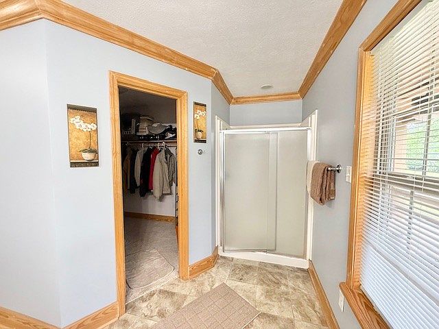 This space features a combination of bathroom and walk-in closet areas with a practical layout. Light gray walls contrast softly with the warm natural wood trim and crown molding, creating a balanced and inviting atmosphere. The floor is tiled with a neutral stone-like pattern, providing durability and visual texture. A compact corner shower with frosted sliding doors maximizes the use of space while maintaining privacy. The walk-in closet is accessible through an open door, revealing organized storage with hanging clothes. A window with venetian blinds allows natural light to gently filter in, enhancing the room’s airy feel.