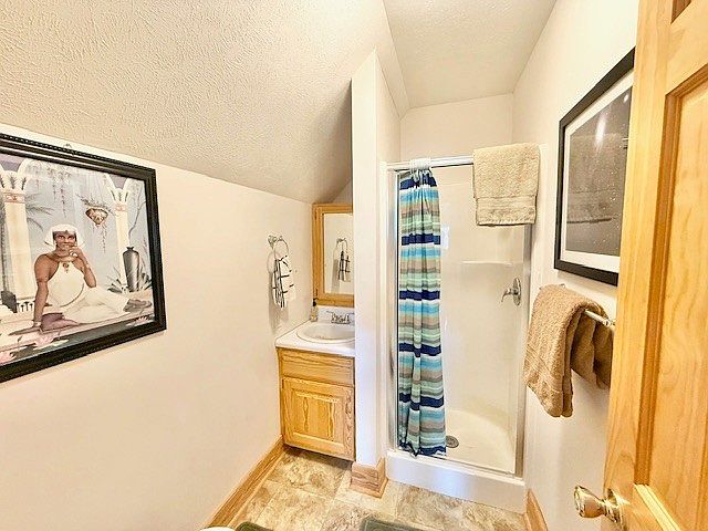 This cozy bathroom features a compact yet functional layout, designed to maximize limited space under a sloped ceiling. It includes a small wooden vanity with a white sink basin tucked into the corner, creating an efficient use of the area. The shower stall is enclosed by a blue and white striped curtain, adding a touch of color and pattern against the otherwise neutral palette. Light wood trim complements the beige tile flooring and off-white walls, creating a warm, inviting atmosphere. Artwork on the walls adds personality and visual interest, while neatly hung towels enhance the space’s practicality and comfort.