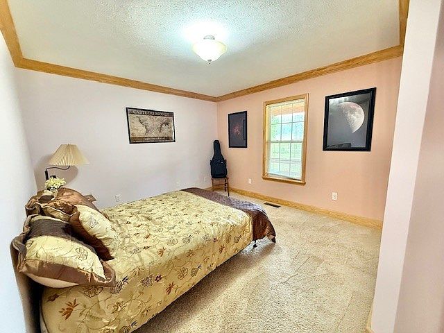 This bedroom features a warm, inviting color palette with soft beige walls complemented by light wood crown molding and trim around the window and baseboards. The carpeted floor lends a cozy and comfortable feel. A full-size bed sits against one wall, adorned with floral-patterned bedding in earth tones that harmonize with the room’s natural wood accents. Wall art includes a vintage map and celestial-themed prints that add personality and a touch of intrigue. Simple furnishings, like a lamp on the bedside table and a guitar perched by the window, create a relaxed, personal atmosphere for unwinding and creativity.