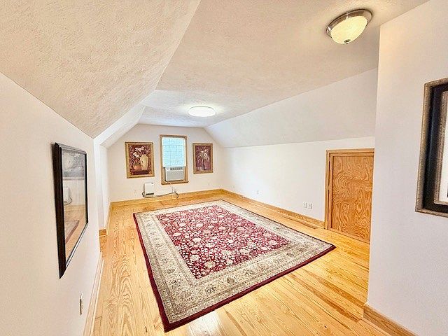 This cozy loft area features sloped ceilings with a smooth white finish, enhancing an intimate and airy atmosphere. Natural wood flooring with a light honey tone adds warmth and contrasts gently with the white walls. A richly patterned area rug in deep reds and cream anchors the space, providing visual interest and softness underfoot. A small window with an air conditioning unit beneath brings in light and ventilation, flanked by two framed art pieces that lend character without overcrowding. A small, rustic wooden door on the side hints at clever storage use within the tucked-away eaves, while minimalist lighting overhead ensures functional illumination.