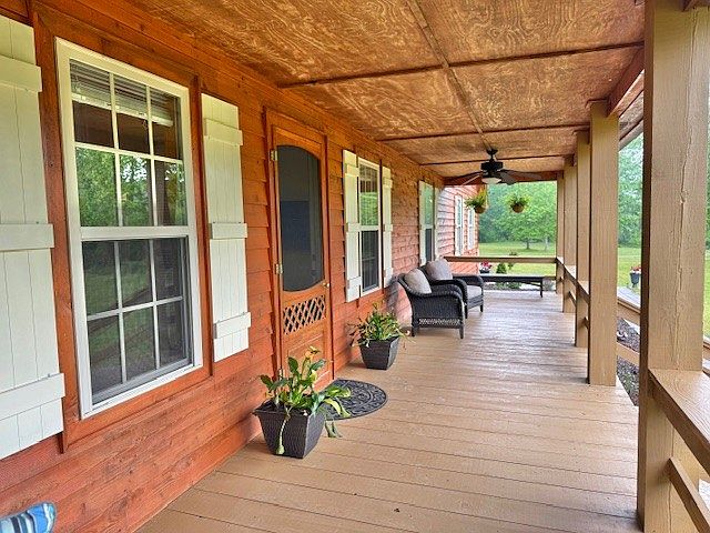 This inviting front porch extends along the wooden exterior of the home, featuring warm reddish-brown logs accented by white window shutters that add a charming farmhouse touch. The ceiling is made of natural wood panels while a ceiling fan with dark blades offers comfort on warm days. Comfortable wicker seating with soft cushions encourages relaxation, complemented by potted plants that enhance the natural vibe. The solid timber porch floor and the rustic screen door with lattice details complete the look, making this an ideal space for enjoying peaceful outdoor views and fresh air.