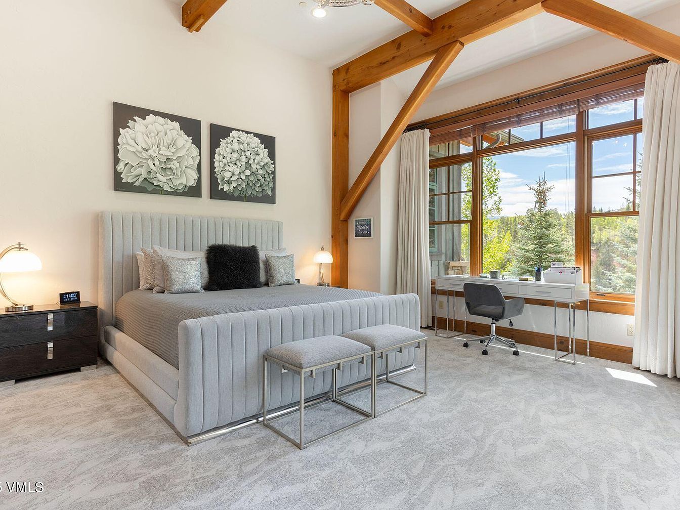 This master bedroom exudes a serene and inviting atmosphere, combining soft neutral tones with natural wood accents. The centerpiece is a plush, light gray upholstered bed adorned with a variety of textured pillows in muted shades of gray and beige. Above the bed, two large floral artworks add subtle sophistication. The room’s architectural charm is emphasized by exposed wooden beams framing a large set of windows, which flood the space with natural light and provide a scenic view of lush greenery outside. Complementing the space is a small, elegant desk by the window and a cozy circular armchair, creating a perfect nook for relaxation or work. Creamy curtains and a light carpet complete the calm, cohesive décor, blending comfort and style seamlessly.