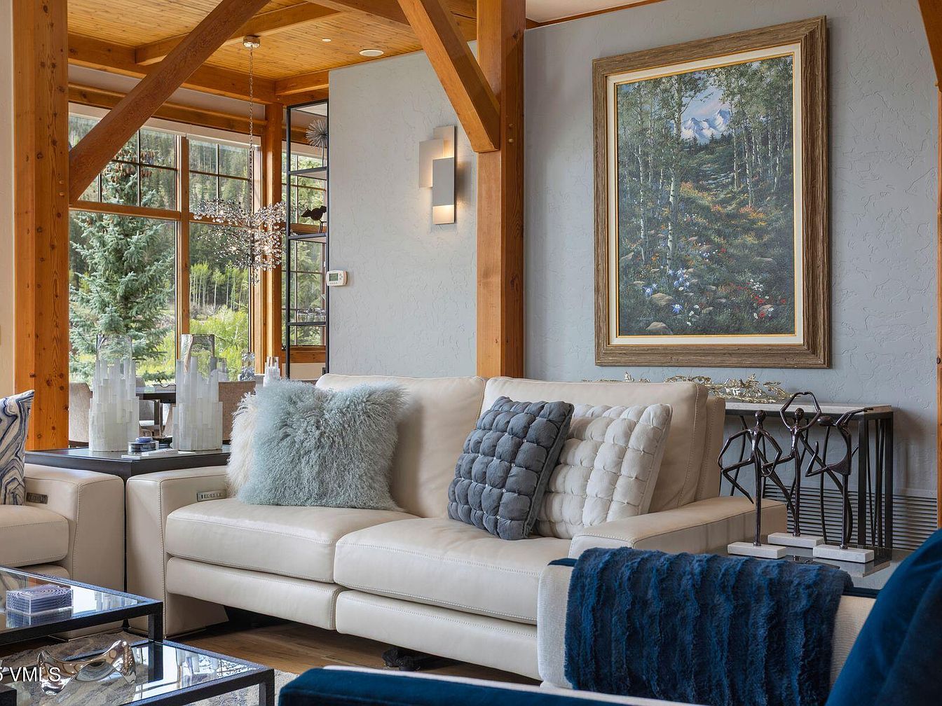 This cozy living room corner features a plush cream leather sofa adorned with an array of textured throw pillows in soft grey, white, and a light blue fluffy design, creating a soothing palette. Exposed wooden beams and ceiling add a warm, rustic charm to the space, complementing the natural views visible through the large windows. The light grey walls provide a neutral backdrop for a framed nature painting that draws the eye. A sleek black console table displays artistic metal sculptures, enhancing the room’s elegant yet comfortable aesthetic. Blue accents on the adjacent chair add richness to the inviting atmosphere.