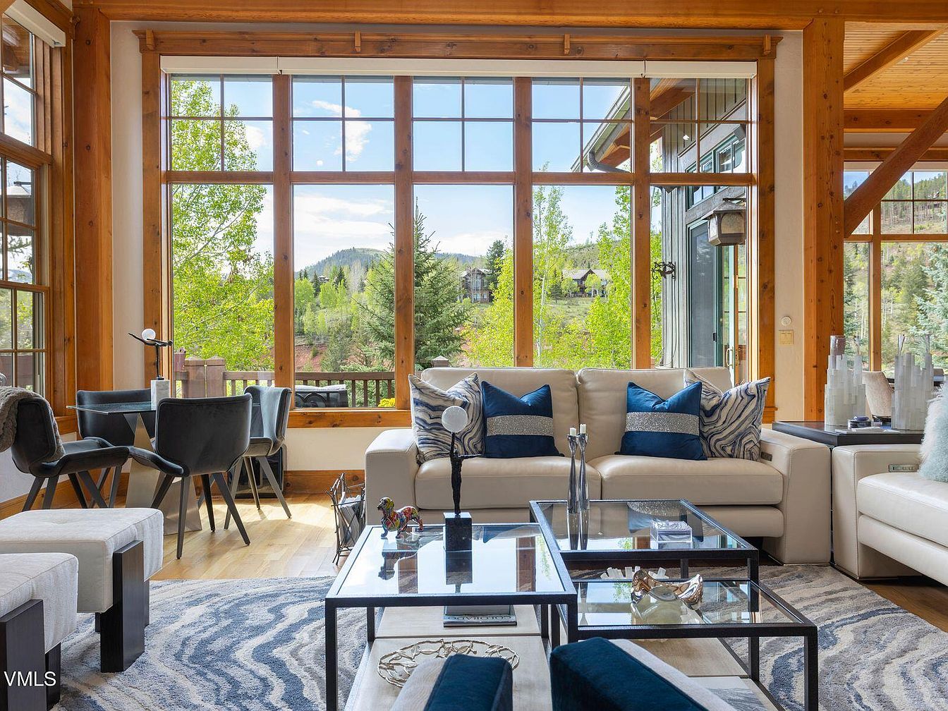 This living room blends natural warmth with modern comfort, featuring expansive wooden-framed windows that showcase a picturesque mountain and tree-filled landscape. The space is anchored by soft, cream-colored leather sofas adorned with deep blue and patterned throw pillows, offering a tactile contrast. Neutral tones dominate with pops of blue seen on the pillows and rug, which carries an abstract, wave-like pattern in shades of grey and blue. A set of sleek, black-framed, glass-topped coffee tables provides contemporary elegance without obstructing the visual flow. Adjacent to the seating, a small dining area with velvet black chairs adds texture, while wood beams and ceiling details emphasize rustic charm alongside the clean, modern furnishings.