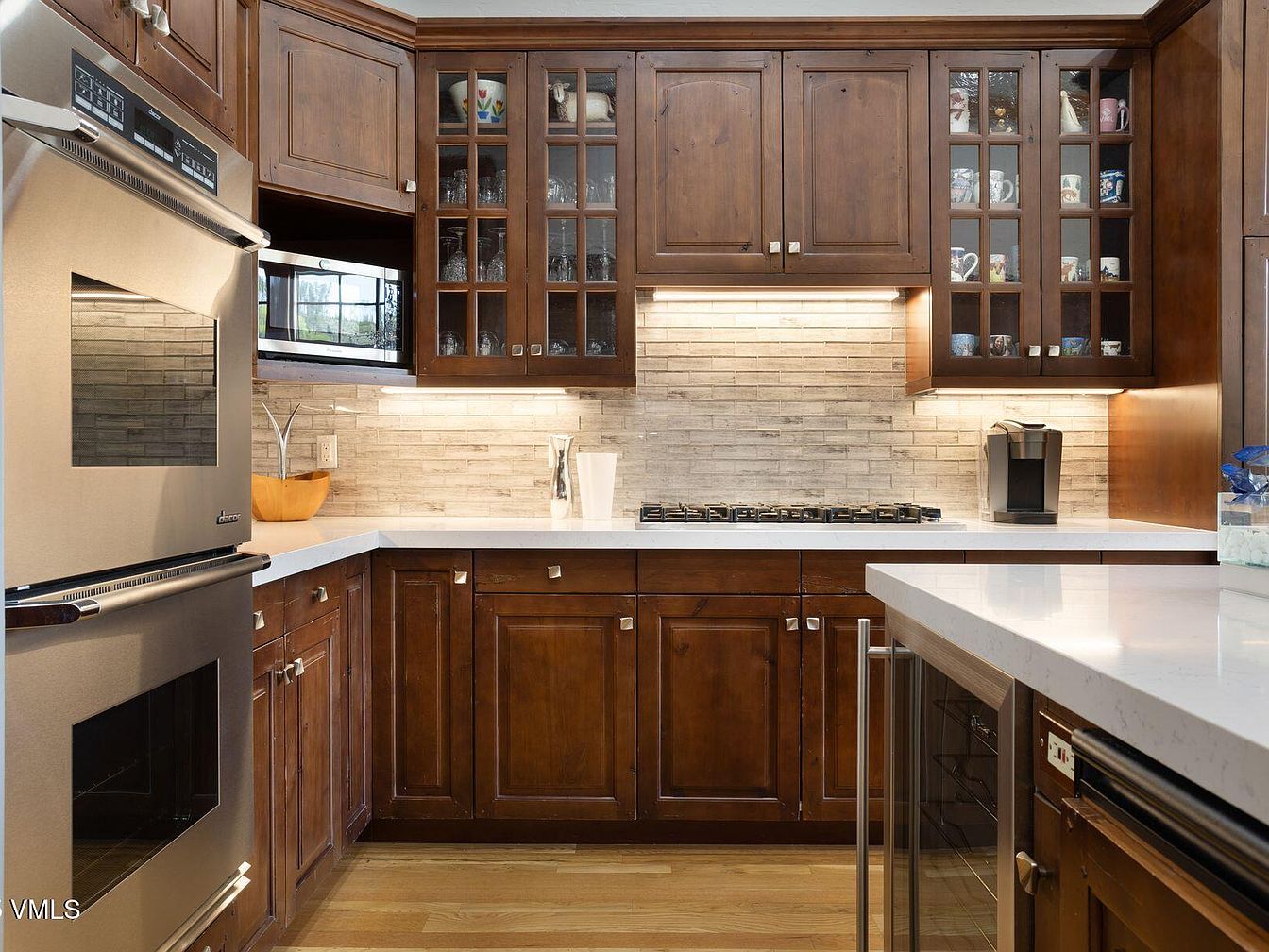 This kitchen corner features a warm, inviting ambiance created by rich wooden cabinetry with a classic paneled design. Glass-front upper cabinets elegantly display a collection of mugs and glassware, adding both charm and function. The bright white quartz countertops offer a clean contrast to the deep brown woods, complemented by a light beige brick-style tile backsplash that introduces texture and subtle variation. Under-cabinet lighting illuminates the workspace, enhancing practicality and atmosphere. Stainless steel appliances, including a built-in oven and a compact microwave, blend modern convenience seamlessly. The open layout and thoughtful storage solutions make this space efficient and appealing.