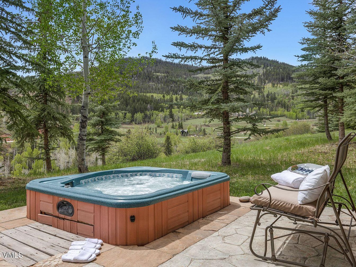 This serene outdoor space features a sunken hot tub with wood paneling and a textured teal-blue interior, surrounded by a natural stone patio that blends effortlessly with the greenery. The hot tub is set against a breathtaking backdrop of evergreen and leafy trees, rolling grassy hills, and distant forested mountains under a bright blue sky. A comfortable metal frame chair with inviting beige cushions and white towels makes for a relaxing spot to enjoy the tranquil views. The area combines rustic charm with thoughtful comfort, creating a perfect retreat for unwinding in nature’s embrace.