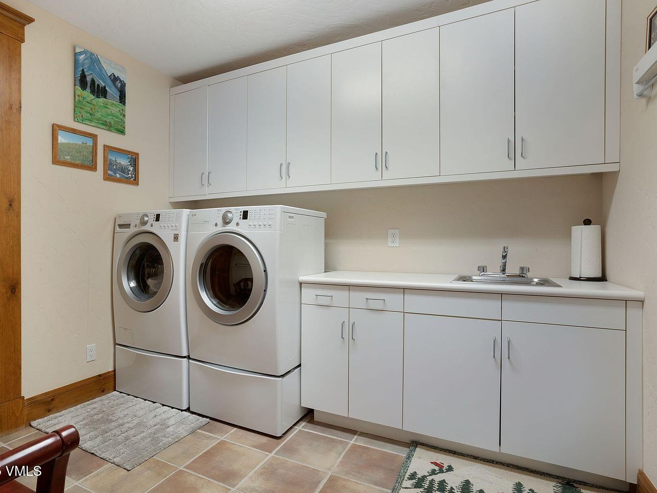 This laundry room features a clean, functional layout with a pair of front-loading white washers and dryers positioned side by side on the left. Above and beside them, white cabinetry offers ample storage space, contributing to an uncluttered and practical workspace. The countertop is smooth and extends to the right, incorporating a small stainless steel sink with a dual-handle faucet, perfect for pre-washing or hand cleaning. Neutral beige walls paired with tile flooring in earth tones and natural wood trim add warmth. Wall art depicting nature scenes adds a cozy and inviting touch to the space.